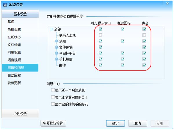 在需要提醒的內(nèi)容后進(jìn)行勾選,同時(shí)選擇提醒的手段,目前有托盤提示窗口、托盤圖標(biāo)和聲音三種選擇。