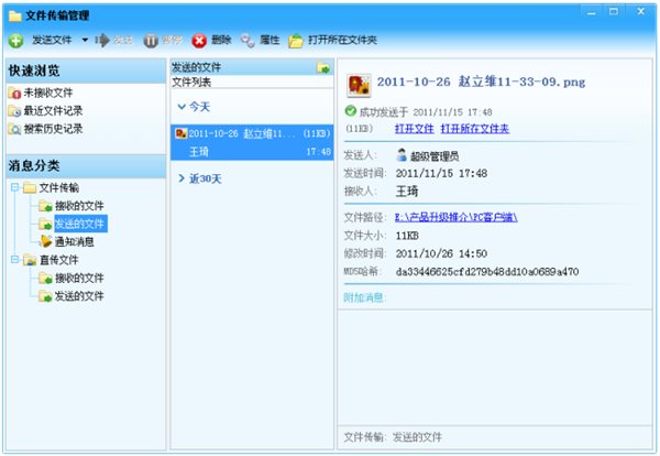 通過桌面客戶端上的文件傳輸管理也可以發(fā)送和接收文件,同時(shí)可對(duì)傳送過的文件歷史記錄進(jìn)行查詢。