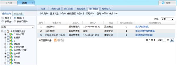 所有通過今目標(biāo)平臺(tái)發(fā)送的短信都會(huì)完整保存下來,以備后續(xù)查詢。同時(shí),有“部門短信查看權(quán)”的成員還可以查看到職權(quán)范圍內(nèi)其他人發(fā)送的短信情況,通過桌面客戶端的“消息中心”可以查看本人短信的發(fā)送和接收情況,在瀏覽器端的“溝通-部門短信”中可以查看其他人發(fā)送的短信情況。
