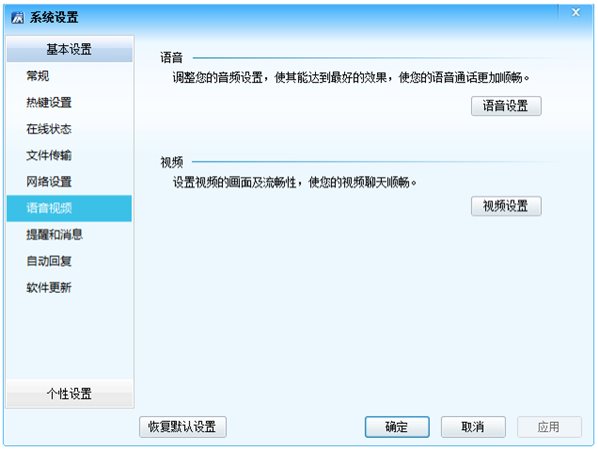 通過“ 主菜單- 設(shè)置- 系統(tǒng)設(shè)置- 語音視頻”,可以對(duì)語音和視頻設(shè)備進(jìn)行設(shè)置,已達(dá)到最佳的使用效果。