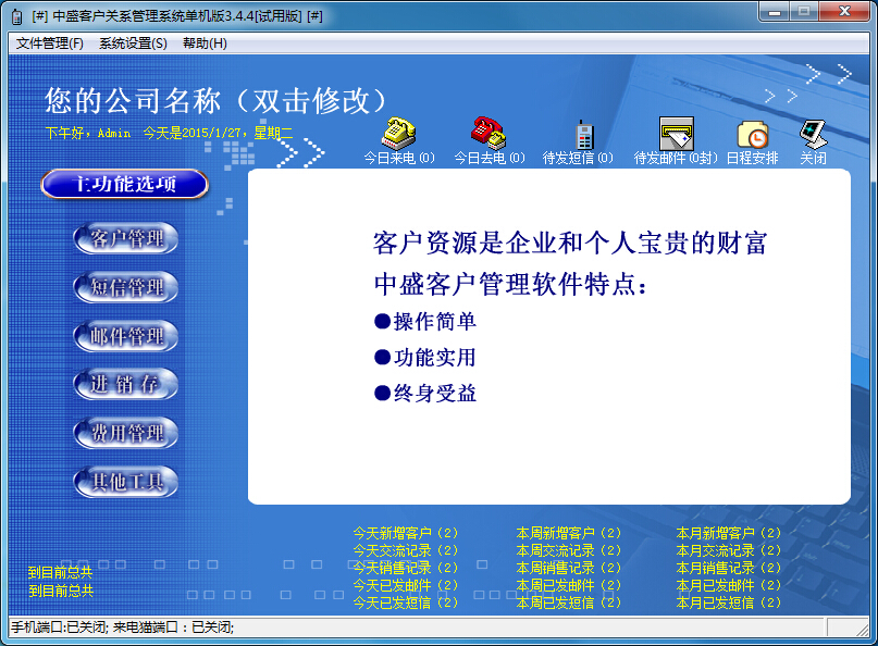 中盛客戶管理軟件是一款綠色免費的客戶管理軟件,這款軟件由中盛電子科技有限公司推出,融合手機短信、客戶跟蹤、日程安排提醒、來電彈出客戶資料、郵件群發(fā)、網(wǎng)絡(luò)客服輔助、信件快遞單打印、精簡進(jìn)銷存等功能于一體。