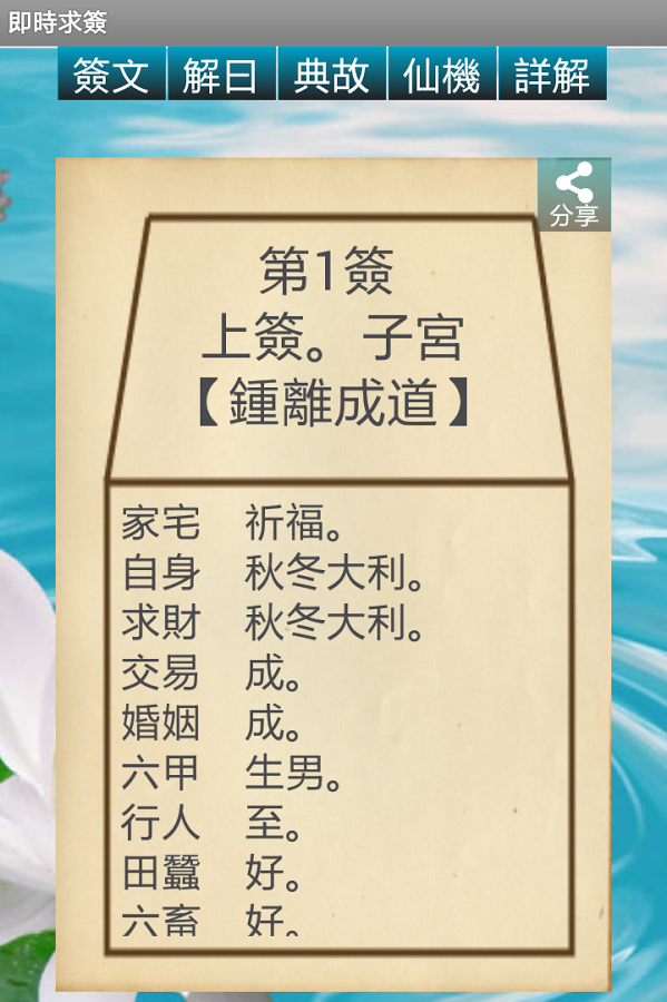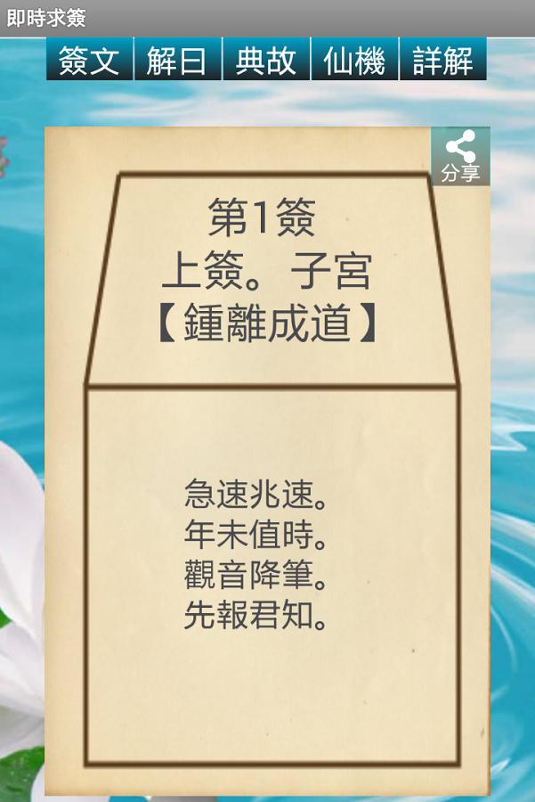 另外,本軟件支援分享功能,可以將簽文跟家人朋友分享。