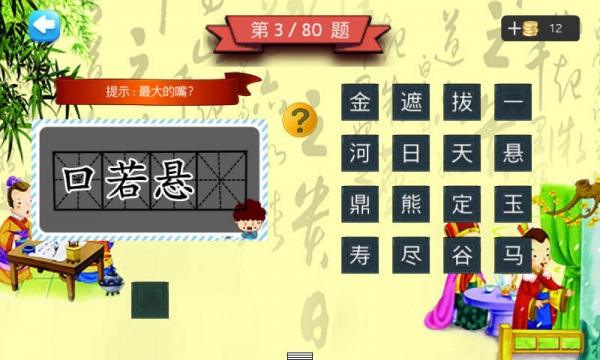 一年級(jí)填成語(yǔ)是一款中文休閑益智游戲,可以體驗(yàn)中國(guó)古老文化-成語(yǔ)的魅力!讓你記憶深刻,充分發(fā)揮你的想象力來(lái)闖關(guān)吧!猜圖玩膩了?猜成語(yǔ)太難?那就來(lái)試試一年級(jí)填成語(yǔ)吧,中華成語(yǔ)博大精深,蘊(yùn)意萬(wàn)千,即使學(xué)渣也可挑戰(zhàn),學(xué)霸也不一定能通關(guān),你敢試試嗎?根據(jù)提示,補(bǔ)全一年級(jí)成語(yǔ)