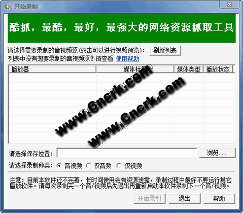 酷錄視頻錄像機 V1.0.0.0 簡體中文綠色免費版 酷錄視頻錄像機絕不是簡單的屏幕錄像,其首創(chuàng)音視頻無損錄制技術(shù),可以對在線音視頻(如在線電視、電影、音樂等)進行同步高保真錄制,100%還原原始音質(zhì)、畫面質(zhì)量。支持任何采用DirectShow技術(shù)的音、視頻播放器(包括視頻聊天)邊看邊錄。