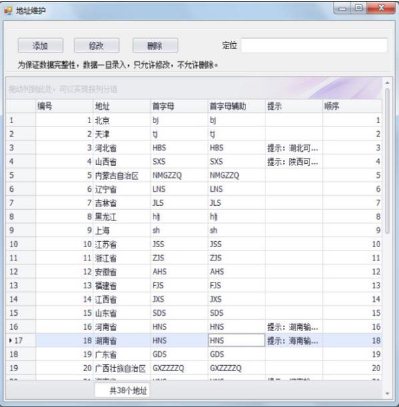 2.1地址維護(hù):點(diǎn)擊地址維護(hù)按鈕可以進(jìn)行地址維護(hù)。地址維護(hù)可以維護(hù)到省份或市縣。每個(gè)地址間不存在相關(guān)性,即“北京”或“北京朝陽區(qū)”對(duì)于系統(tǒng)來說是兩個(gè)地區(qū),它們沒有任何關(guān)系。