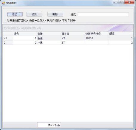 點(diǎn)擊快遞維護(hù)按鈕可以進(jìn)行快遞維護(hù)。在定位中輸入快遞或快遞首字母,可以準(zhǔn)確定位到該快遞信息。