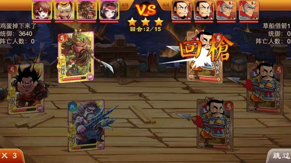 游戲采取是卡牌的自動(dòng)對(duì)戰(zhàn),玩家要做的就是布陣,戰(zhàn)斗中可上場(chǎng)有三位,死亡后替補(bǔ)武將上場(chǎng),全陣亡視為失敗。前期想要三星通關(guān)的玩家盡量選擇生存力較高的武將上場(chǎng),因?yàn)榍捌谥灰懒艘粋€(gè)武將就沒辦法三星通關(guān)了,所以就算慢一點(diǎn)打過也要保證上場(chǎng)的存活。