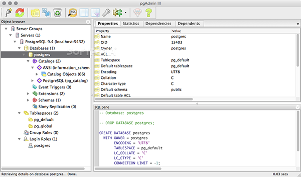 PostgreSQL Mac版是一款Mac平臺上強大的,開源的關(guān)系型數(shù)據(jù)庫系統(tǒng),擁有超過15年的積極發(fā)展。PostgreSQL完全ACID兼容,全力支持外鍵,連接,視圖,觸發(fā)器和存儲過程(多語言)。它包括大部分SQL92和SQL99中的數(shù)據(jù)包括整數(shù),數(shù)字,布爾值,為char,varchar,日期,區(qū)間,和TIMESTAMP類型【軟件特點】