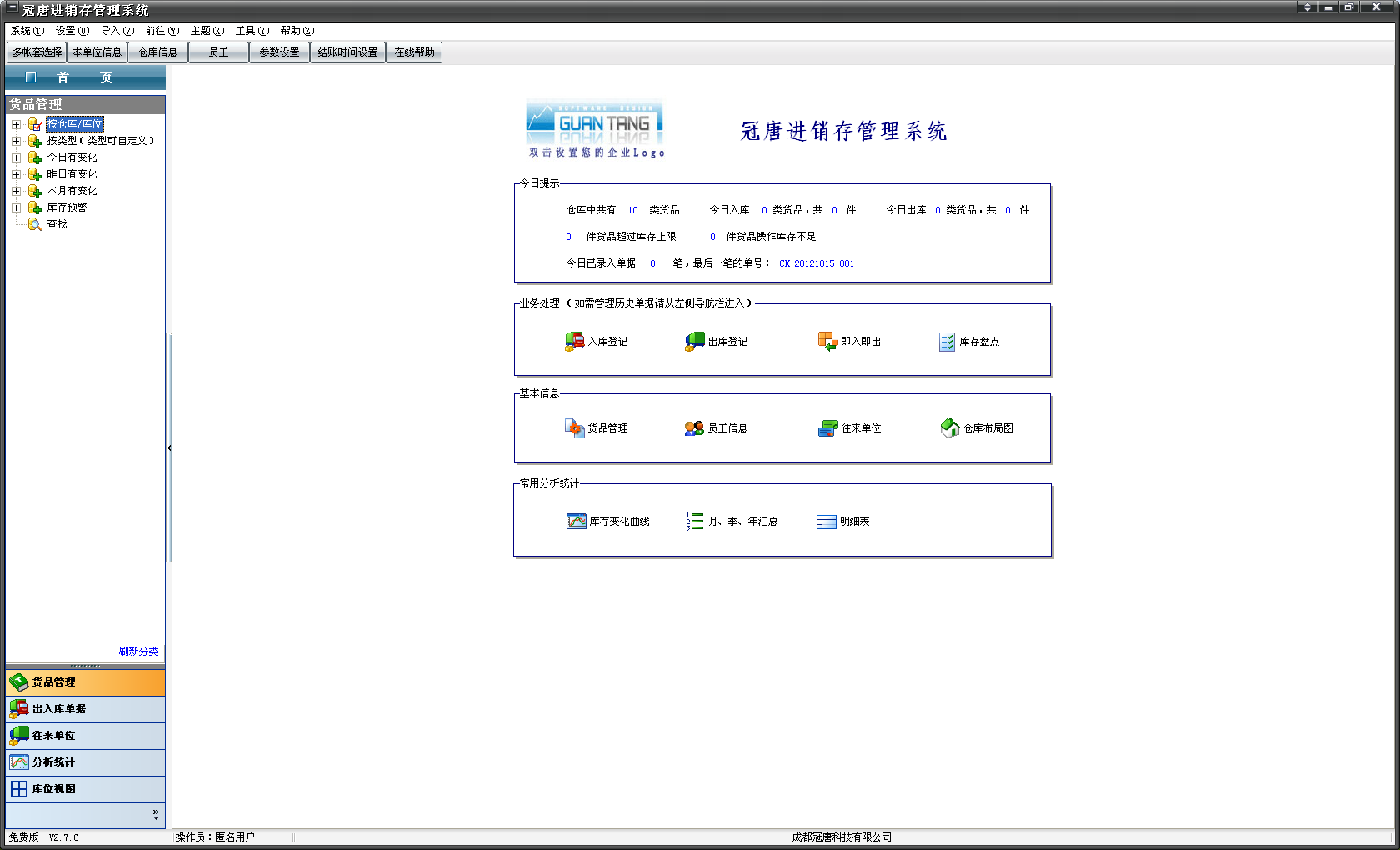 冠唐進銷存軟件提供簡潔易用的免費版和功能全面的付費版本,是一個適合中小企業(yè)的功能強大,簡單易用進銷存管理軟件。用戶只需簡單的記錄貨品信息和出入庫單據(jù),系統(tǒng)自動根據(jù)每筆出入庫記錄自動完成貨品的庫存增減,自動分類統(tǒng)計,統(tǒng)計任一時間的進倉、出倉等匯總數(shù)據(jù),物品庫存數(shù)據(jù)一目了然。【軟件特點】