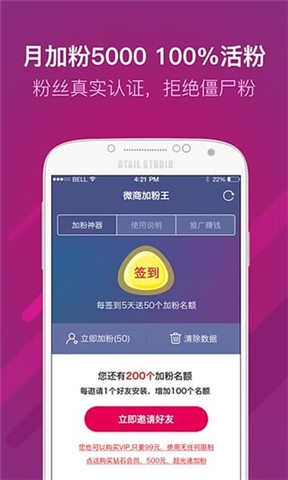 加粉神器,分分鐘坐擁百萬粉絲!微商加粉王是一款微商必不可少的加粉神器,為用戶快速添加的微信粉絲,每天輕松增加上千的微信好友,輕松完成微信好友批量添加,更有微信自動加粉效果驚人,全部真實粉絲,絕無僵尸粉!得粉絲者得天下,微商創(chuàng)業(yè)第一平臺!
