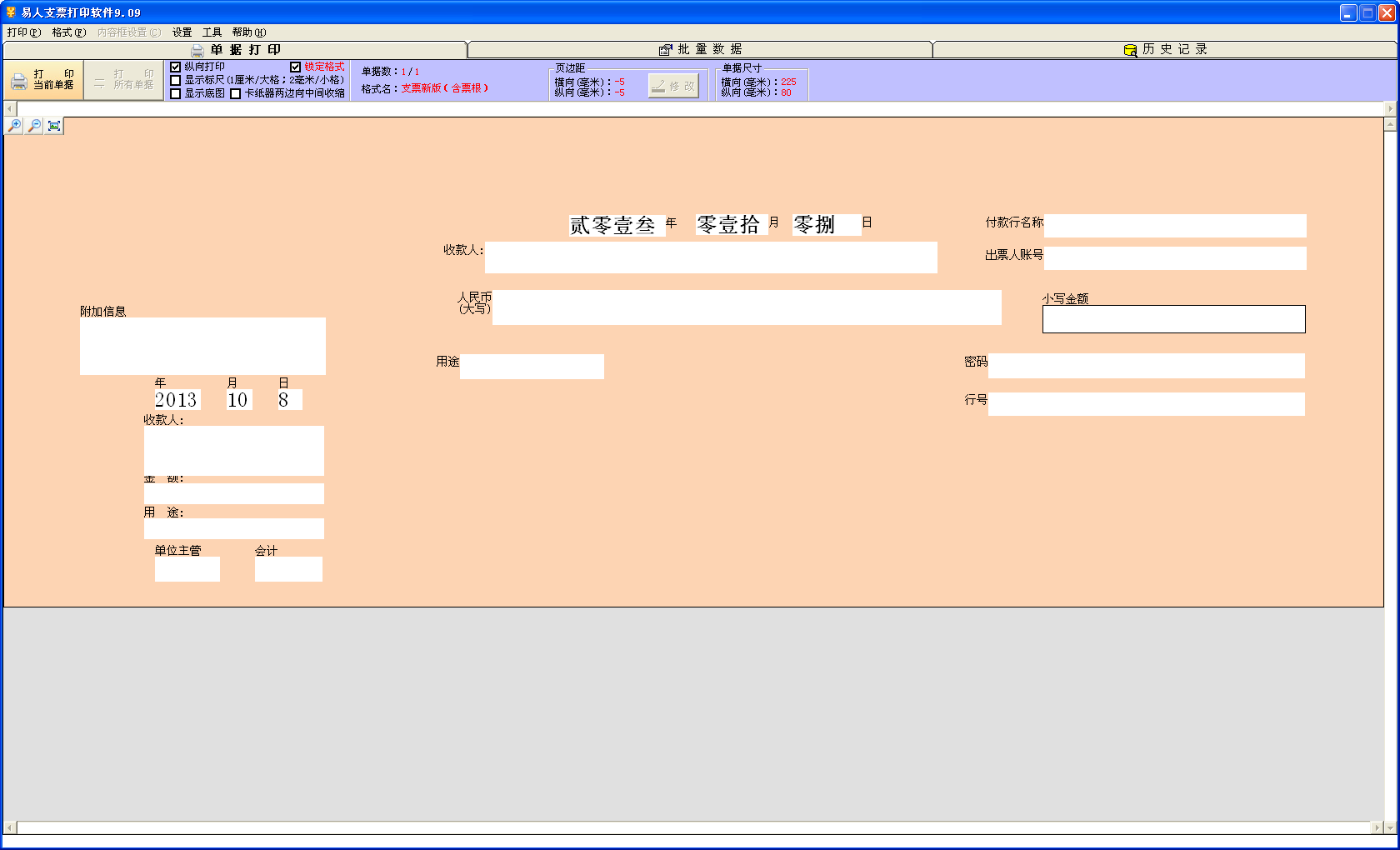 1.內(nèi)容輸入:用戶可直接輸入,部分內(nèi)容可雙擊文本框,從易人支票打印軟件歷史記錄中選取。
