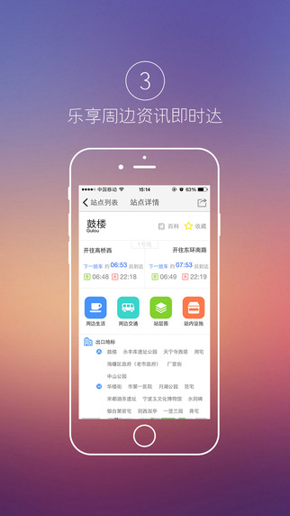 【出行指引】通過選擇起點(diǎn)終點(diǎn)的車站、地標(biāo)建筑,即時(shí)獲得重要旅程資訊,包括票價(jià)、建議線路、預(yù)計(jì)乘車時(shí)間、換乘指示及目的地車站出口建議等;提供車站綜合資訊,包括車站百科、站層圖、站內(nèi)設(shè)施、周邊交通、周邊生活、出口地標(biāo)、站外街區(qū)圖等。
