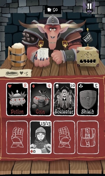 《卡牌潛行者 Card Crawl》是一款基于地下城桌游打造的卡牌游戲。玩家需要與坐在自己面前怪物進行卡牌對決,每回合都能抽5次,由于獲得的卡片技能效果各有不同,因此只有合理搭配才能順利過關(guān)喲。