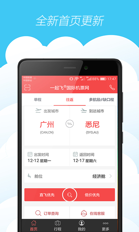 一起飛app,國(guó)內(nèi)領(lǐng)先的機(jī)票服務(wù)應(yīng)用。一起飛app提供全球機(jī)票預(yù)訂服務(wù),包含近200個(gè)國(guó)家和快五千座城市,機(jī)票酒店簽證一站式服務(wù),讓您國(guó)際旅行更省心。【功能說明】
