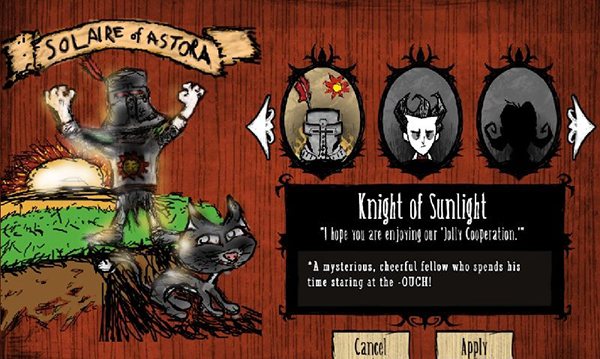 饑荒黑暗之魂MOD是專門為同名游戲開發(fā)制作的一款mod文件,通過添加這款文件,游戲會仿照黑暗之魂中的騎士造型新增人物Solaire,讓玩家可以以全新的角色形象體驗不一樣的游戲趣味。
