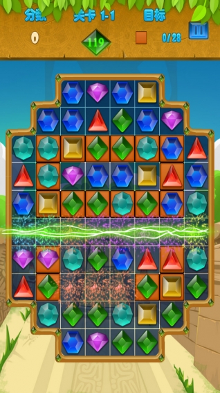 這是Android平臺上一款經(jīng)典的三消寶石消除類的游戲,你的任務贏得鉆石之星,嘗試每一個關卡都能夠獲取所有的星星。 將三個或三個以上相同顏色的鉆石排在一起即可將它們消除掉。