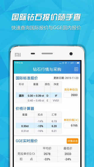 全球鉆石交易Android端App為鉆石交易提供最快捷的數(shù)據(jù)查詢服務(wù);鉆石價(jià)格計(jì)算器,精確、直觀地體現(xiàn)鉆石性價(jià)比;