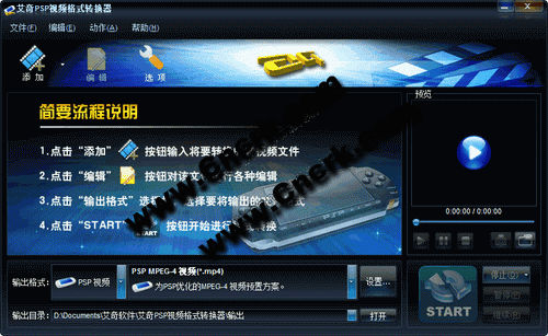 艾奇PSP視頻格式轉換器軟件,可以方便的將AVI、MPG、WMV、RM、MKV、FLV等任何常見視頻格式轉換成可以在SONY PSP機上播放的MP4等格式。艾奇PSP視頻格式轉換軟件具備H.264編碼功能,可以轉出更加清晰的視頻。讓PSP播放影片更省電。同時支持MP3等各種音頻文件的轉換。