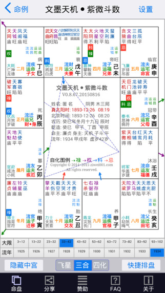 3.提供精心設(shè)計(jì)的排盤界面,風(fēng)格簡約而不簡單,兼容命理師和紫微斗數(shù)愛好者的既有使用習(xí)慣,盤面布局和配色風(fēng)格與使用廣泛的飛星、三合排盤軟件保持一致,大幅降低使用門檻。