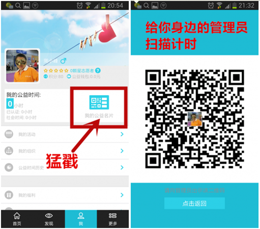 打開(kāi)“志愿者打卡器”APP出示個(gè)人公益名片(即個(gè)人二維碼)給管理員掃描。