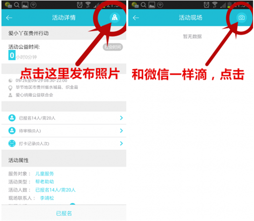 所有報(bào)名參加的活動(dòng),可以通過(guò)照片進(jìn)行記錄,同時(shí)志愿者打卡器APP也提供各種分享功能。