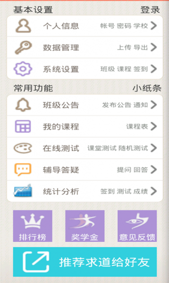 求道是專門為高校、職業(yè)院校、中專技校等學(xué)校的師生量身制作的一款手機(jī)互動交流應(yīng)用,這款軟件具有課程表、簽到考勤、在線測試、課堂監(jiān)控、成績分析等特色功能,從而杜絕教室手機(jī)泛濫,還原最真實的課堂。