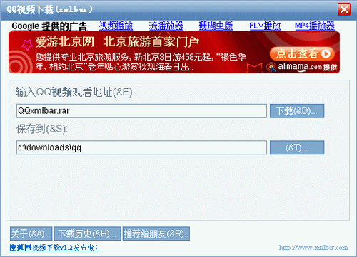 QQ視頻下載(xmlbar) V3.3 簡體中文綠色免費版 QQ視頻下載(xmlbar)是一個專門用于下載QQ視頻到本機硬盤上的小軟件。它不但完全免費而且不含有任何插件,可以完全干凈卸載。用戶只需輸入需要下載的QQ視頻的觀看頁面地址并按下下載按鈕,或者更方便的使用拖放方法將頁面地址從瀏覽器地址欄拖到本軟件的浮動窗口,它就會自動識別后進行下載,下載的文件格式為flv。更好的是它還支持多個QQ視頻文件同時下載,并能顯示出真實的QQ視頻文件的下載地址,下載完后您還可以選擇馬上播放,而且它還有查看管理下載歷史記錄的功能