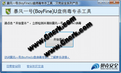 貝殼安全出品《暴風(fēng)一號(BoyFine)U盤蠕蟲病毒專殺工具》幫你完美清除病毒,修復(fù)被感染文件,還你一個(gè)正常的操作系統(tǒng)。
