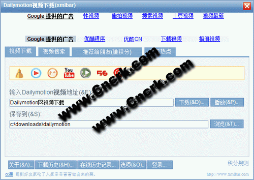Dailymotion視頻下載(xmlbar)是一個(gè)專門用于下載Dailymotion視頻到本機(jī)硬盤上的小軟件。它不但完全免費(fèi)而且不含有任何插件,可以完全干凈卸載。用戶只需輸入需要下載的Dailymotion視頻的觀看頁面地址并按下下載按鈕,它就會自動識別后進(jìn)行下載,或者更方便的使用拖放方法將頁面地址從瀏覽器地址欄拖到本軟件的浮動窗口,它就會自動識別后進(jìn)行下載,下載的文件格式為flv。更好的是它還支持多個(gè)Dailymotion視頻文件同時(shí)下載,并能顯示出真實(shí)的Dailymotion視頻文件的下載地址,下載完后您還可以選擇馬上播放,而且它還有查看管理下載歷史記錄和視頻搜索的功能