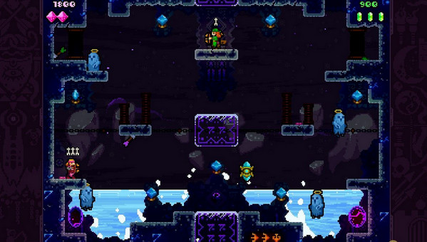 在游戲中,玩家并不是只有靠弓箭才可以殺死敵人,也可以像超級馬里奧那樣跳起來踩死敵人。弓箭是有支數的,支數顯示在你的頭上,你頭上有幾個箭頭就有幾支箭,不是用完就沒有了,每次當你把箭支射出去后,都是可以把它撿回來。游戲中畫面是可以互通的,也就是說,你從下面掉下去,是會從上面對應位置掉下來的,當然左右兩邊也是這樣,所以更加考驗你的反應能力了。