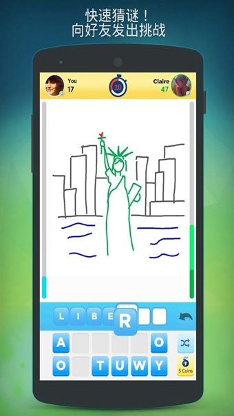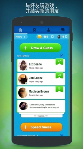 《你畫我猜-極速猜想SpeedGuess-Something'》是廣受玩家喜愛(ài)的你畫我猜類社交游戲DrawSomething的續(xù)作!您可以選擇繼續(xù)與朋友和其他玩家一起玩畫圖猜謎(完全兼容前作),與此同時(shí),我們這次引入了一種全新的游戲模式,還有與好友取得聯(lián)系的全新方式。