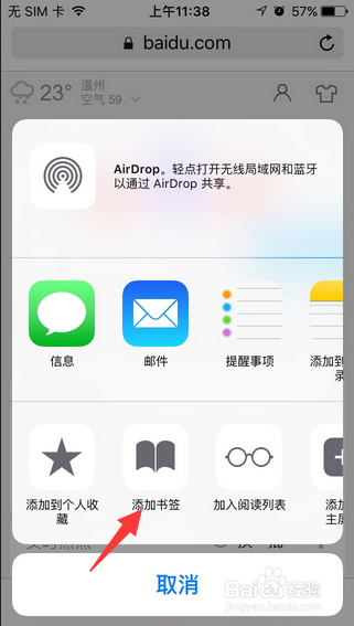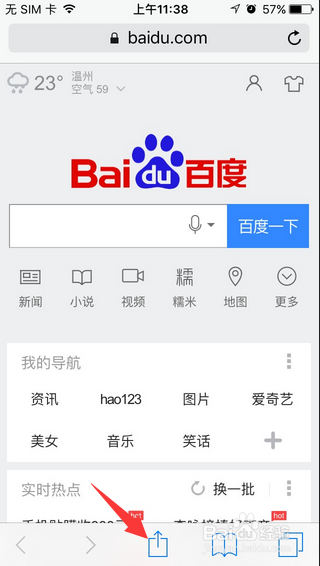 2.打開網(wǎng)站之后,在safari游覽器頁底的中間按一下分享的箭頭(如圖)。