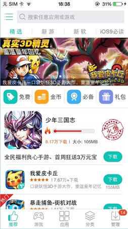 1、進(jìn)入軟件后首先看到的是推薦頁(yè)面,在這個(gè)頁(yè)面中為大家推薦了精選的游戲和軟件,還有最新的游戲和軟件,對(duì)于ios9用戶(hù)還有必讀的注意事項(xiàng)喲。