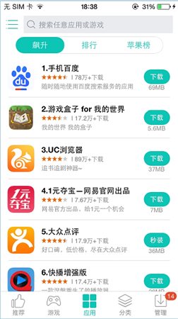 3、進(jìn)入應(yīng)用頁(yè)面,我們可以看到最新飆升、排行以及蘋(píng)果榜的相關(guān)軟件信息。