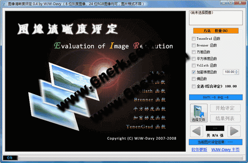 軟件包含了多種清晰度評價(jià)函數(shù):TenenGrad 函數(shù)、Brenner 函數(shù)、方差函數(shù)、平方梯度函數(shù)、Vollath 函數(shù)、加窗梯度函數(shù)、熵函數(shù)。 軟件可以進(jìn)行多個(gè)函數(shù)的權(quán)重分配計(jì)算,并將結(jié)果列表顯示,評價(jià)結(jié)果可以保存。軟件支持多種格式的圖像文件(如:jpg、bmp、png、gif、tiff等等),可以處理8位灰度圖像、24位RGB圖像??梢曰旌咸幚砀鞣N大小的圖片,分辨率大小不限。