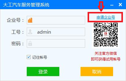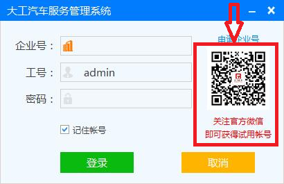 掃描軟件登陸界面右側(cè)下方的微信二維碼或關注“dagongsoft”微信公共號,關注官方微信即可獲得試用賬號。