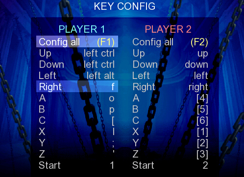 1P:方向:E、D、S、F 拳:L(輕) ;(重) 腳:O(輕) P(重)2P:方向:上、下、左、右 拳:小鍵盤1(輕) 小鍵盤2(重) 腳: 小鍵盤4(輕) 小鍵盤5(重)