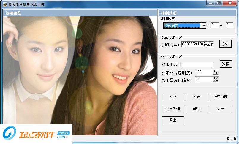 圖片壓縮,縮小圖片尺寸,圖片旋轉(zhuǎn),圖片加文字或圖片水印,調(diào)整亮度與對(duì)比度,圖片去色,去除圖片Exif信息(拍攝時(shí)間,相機(jī)型號(hào)信息),CMYK轉(zhuǎn)RGB等,全部支持批量處理。支持處理的圖片格式:JPG, PNG, BMP, GIF(靜態(tài)), PSD, TBI。注意:圖片處理后將采用JPG格式保存。這是一款綠色軟件,下載后解壓縮就能使用,無(wú)需安裝。