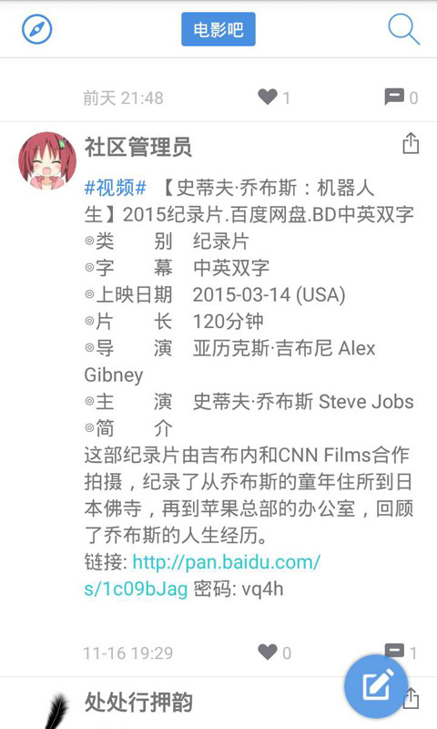 電影吧,視頻資源分享社區(qū),網(wǎng)盤(云盤)社區(qū)。在這里,你可以查看別人分享的最新資源,也可以發(fā)帖求資源,加好友,形成朋友圈。支持文字、圖片、表情,帖子收藏,豐富的消息系統(tǒng),可以點贊,收藏,評論。帖子自動識別帖子中的鏈接,點擊直接打開資源網(wǎng)頁。