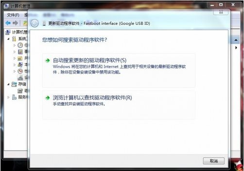 2、右鍵“android”--“更新驅(qū)動程序軟件”--“瀏覽計(jì)算機(jī)以查找驅(qū)動程序”