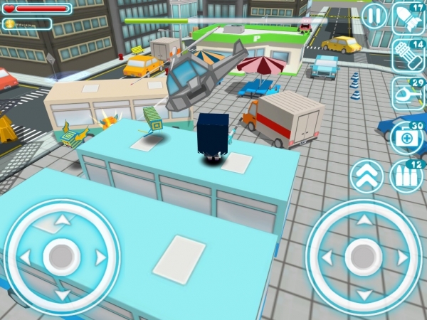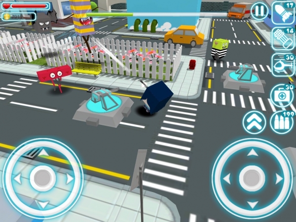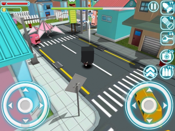 一座被外星怪物占領(lǐng)的紙模風(fēng)格糖果色小鎮(zhèn),在小鎮(zhèn)上可以全地形作戰(zhàn),不管是屋頂、車頂還是路燈甚至是電線桿都可以作為你的作戰(zhàn)據(jù)點(diǎn)