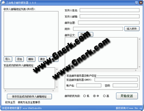 注意事項:1、發(fā)送郵件服務(wù)器及帳戶設(shè)定必須正確,否則將無法發(fā)送郵件。不同的發(fā)送郵件服務(wù)器的發(fā)送成功率會有所不同;2、發(fā)送郵件的過程中請不要修改郵件的內(nèi)容或參數(shù),如需修改請先停止發(fā)送;3、為了保證發(fā)送郵件的帳戶安全,請不要在公用電腦上使用本程序。