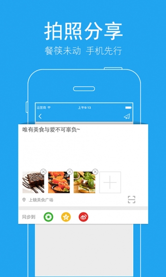 拍攝美食照片分享至朋友圈、微博、QQ空間就能享受商家優(yōu)惠活動~!