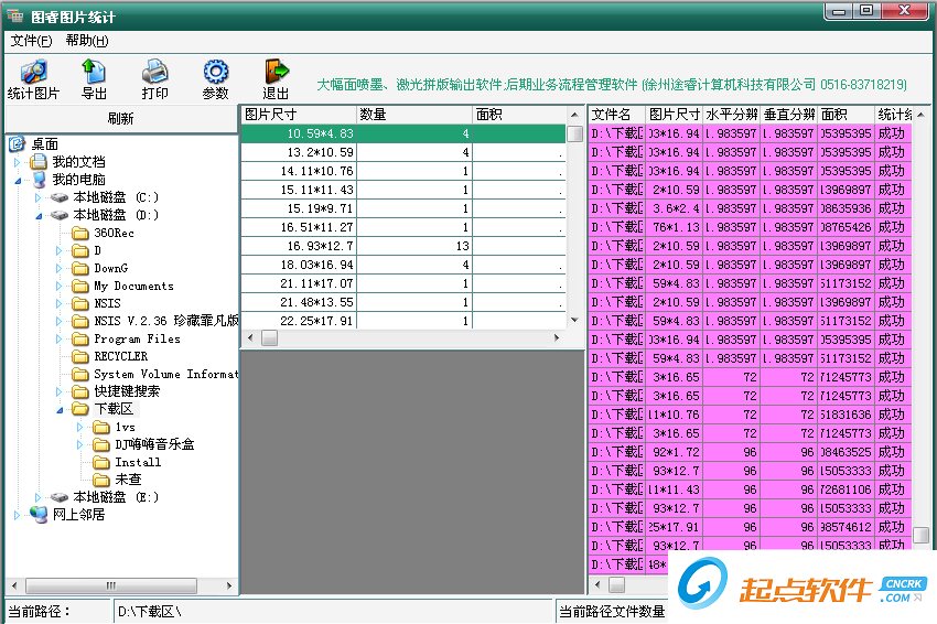 圖睿圖片統(tǒng)計(jì)是一款可以將指定目錄下的圖片(包括其子目錄內(nèi)的圖片)進(jìn)行統(tǒng)計(jì)匯總,按規(guī)格分類統(tǒng)計(jì)面積,您可以通過軟件非常方便、準(zhǔn)確地知道客戶所傳給你的所有圖片有幾種規(guī)格(長(zhǎng)寬)、每種規(guī)格的面積是多少以及每張圖片的規(guī)格尺寸等信息,從而根據(jù)您的價(jià)格來方便地計(jì)算出金額。操作異常方便、簡(jiǎn)單,您只需要指定一個(gè)客戶圖片的總目錄,然后按下"統(tǒng)計(jì)圖片"按鈕,程序就會(huì)自動(dòng)進(jìn)行統(tǒng)計(jì),不需要您進(jìn)入子目錄一層一層的統(tǒng)計(jì),然后手工匯總,適合目前尚未使用開單軟件、或開單軟件中沒有自動(dòng)計(jì)算圖片面積功能的客戶。