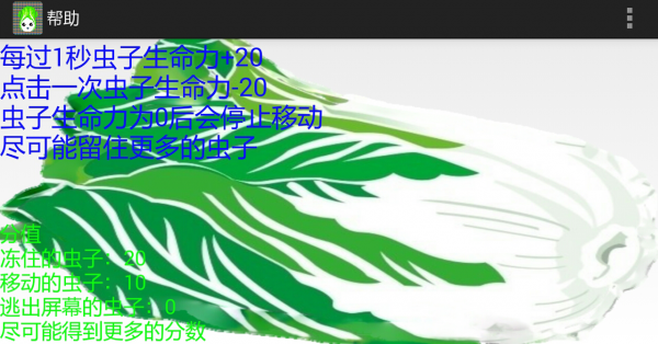打蟲(chóng)子是一款休閑類游戲,將害蟲(chóng)留在有毒的白菜上,不要讓它們禍害到其它的白菜!屏幕上的第一顆白菜是有毒的,點(diǎn)擊蟲(chóng)子降低它們的行動(dòng)速度!時(shí)間到了,它們還留在屏幕上,你就可以獲得分?jǐn)?shù)!生命力超低的蟲(chóng)子,在屏幕上會(huì)閃閃發(fā)光哦!瘋狂的點(diǎn)擊蟲(chóng)子吧!