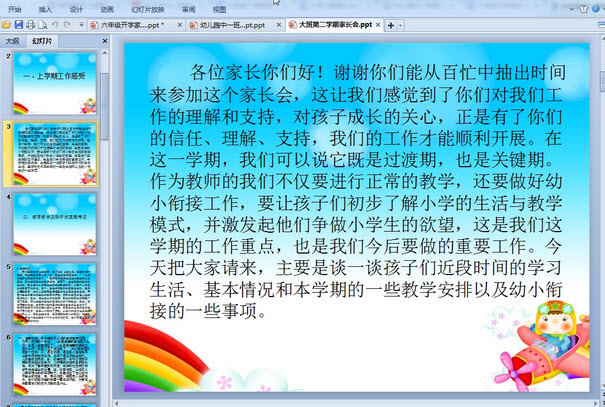 幼兒園大班新學(xué)期家長(zhǎng)會(huì)PPT課件(精選家長(zhǎng)會(huì)PPT)是一篇幼兒園大班《新學(xué)期家長(zhǎng)會(huì)》PPT課件,課件共有23頁(yè)內(nèi)容制作比較精美,新學(xué)期已經(jīng)到了,主要介紹了班級(jí)情況分析、本學(xué)期的教育和保育問(wèn)題等內(nèi)容,為大班學(xué)生想小學(xué)一年級(jí)提供了心理上的準(zhǔn)備。【開學(xué)寄語(yǔ)】