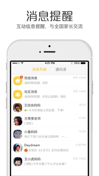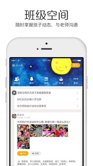 家園溝通——上班時,出差時,你可以隨時通過貝聊了解動態(tài),寶寶在幼兒園吃什么,學(xué)什么一目了然。幼兒園通知置頂,方便查看,絕不漏掉。社區(qū)溝通——貝聊社區(qū)有很多聰明的寶爸寶媽,在貝聊,你可以跟他們聊聊你的育兒煩惱,分享你的育兒快樂。你還可以學(xué)到很多陪寶寶玩的實操技巧和方法。讓家長和寶寶一起快樂成長。