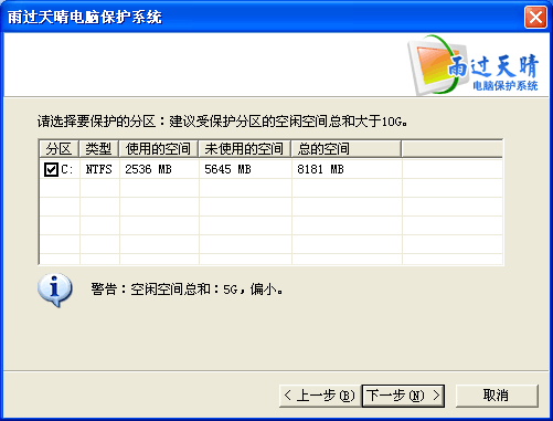 雨過天晴專業(yè)版安裝時(shí)默認(rèn)只保護(hù)系統(tǒng)盤,您可以自由選擇要保護(hù)的分區(qū);請注意,保護(hù)分區(qū)一旦選定,將不能進(jìn)行更改,如果要更改的話需要重新安裝軟件。
