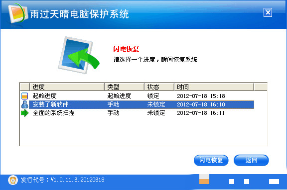 2.在主程序中,單擊【閃電恢復(fù)】;在彈出界面的進(jìn)度列表中選擇一個(gè)進(jìn)度;然后點(diǎn)擊【閃電恢復(fù)】,恢復(fù)系統(tǒng)需要重新啟動(dòng)電腦,電腦重啟后系統(tǒng)就會(huì)恢復(fù)到選定的進(jìn)度。