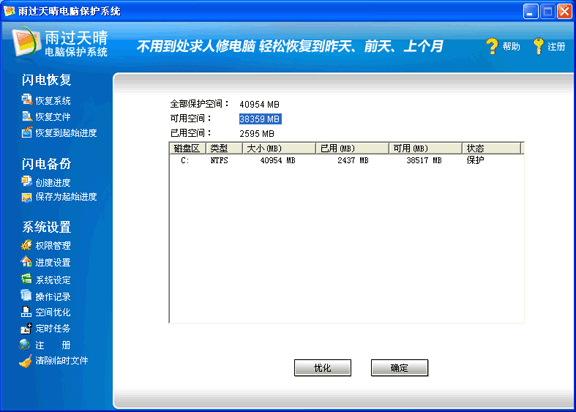 2.安裝完雨過天晴專業(yè)版之后,用戶不能運(yùn)行磁盤碎片整理功能,使用此功能并不能起到相應(yīng)的作用,還有可能會(huì)浪費(fèi)硬盤空間;雨過天晴專業(yè)版本身有自帶的系統(tǒng)優(yōu)化功能,用戶可以使用這一功能進(jìn)行空間優(yōu)化,以提高系統(tǒng)工作效率。